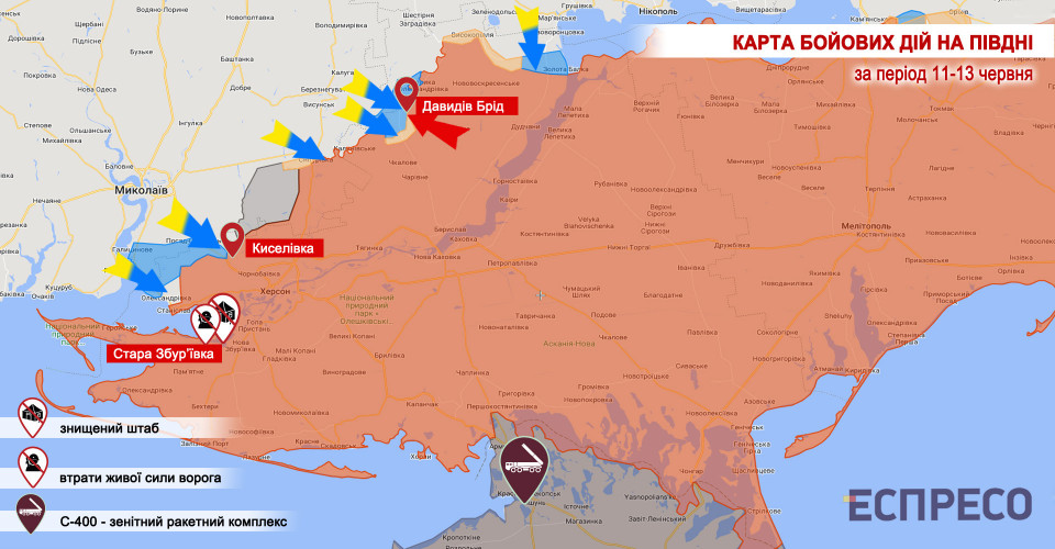 Біля Давидового Броду тривають запеклі бої. Українська армія дещо розширила плацдарм на лівому березі Інгульця, підійшовши до Брускинського і Костромки. Південніше ЗСУ займають позиції біля Киселівки, а бійці заявляють, що перебувають за 10 км від Херсона.
