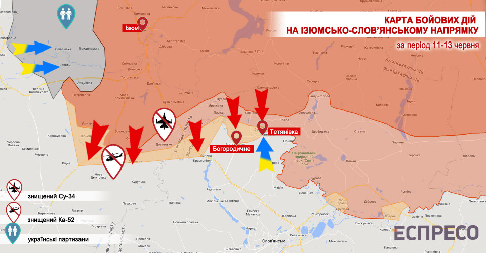 На Ізюмському напрямку 13 червня ЗСУ знищили бойовий гелікоптер російської армії Ка-52, а в районі Ізюма збили винищувач-бомбардувальник Су-34.