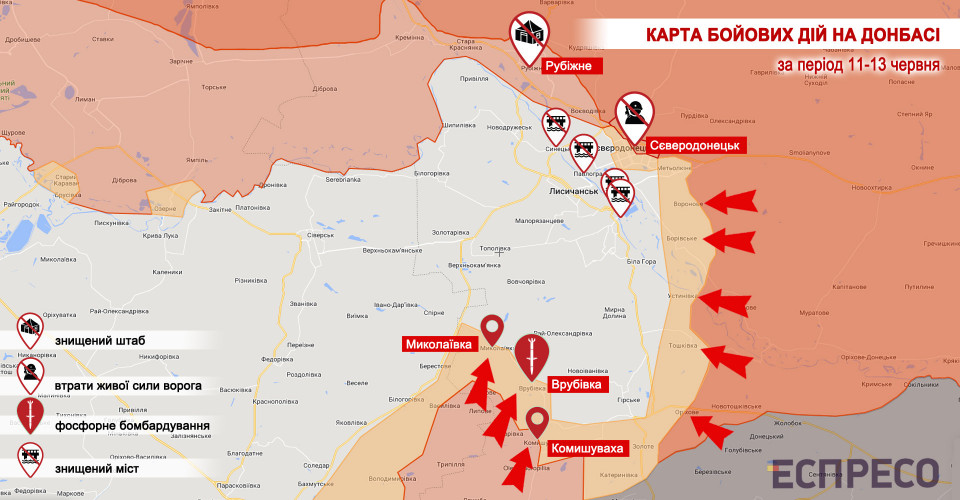Рашисти знову прицільно обстріляли мости між Лисичанськом і Сєверодонецьком і зруйнували ще 2, які раніше були відносно цілими. Тепер підвезення гуманітарних вантажів та евакуація неможливі. В місті залишилося близько 9 тис. мирних мешканців. Водночас залишилися канали постачання озброєння. Ймовірно, раніше окупанти берегли ці мости з метою використати їх для наступу на Лисичанськ. Але зараз від цієї ідеї відмовилися, маючи намір заблокувати українських військових і створити ситуацію, схожу до Маріуполя.